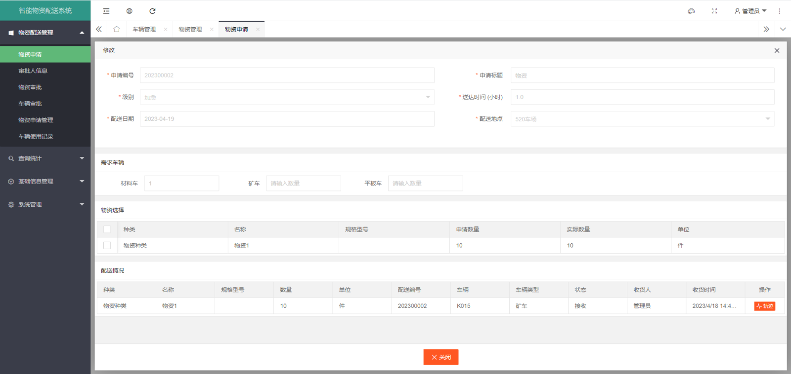使用單位需提前對配送物資申請礦車配送計劃,主要申請礦車的使用地點、使用類型、礦車使用數(shù)量和礦車型號,申請完畢后需提交到礦車管理部門進行審批。礦車管理部門對使用單位的配送計劃進行審核,經(jīng)審核完成后才可以使用礦車。